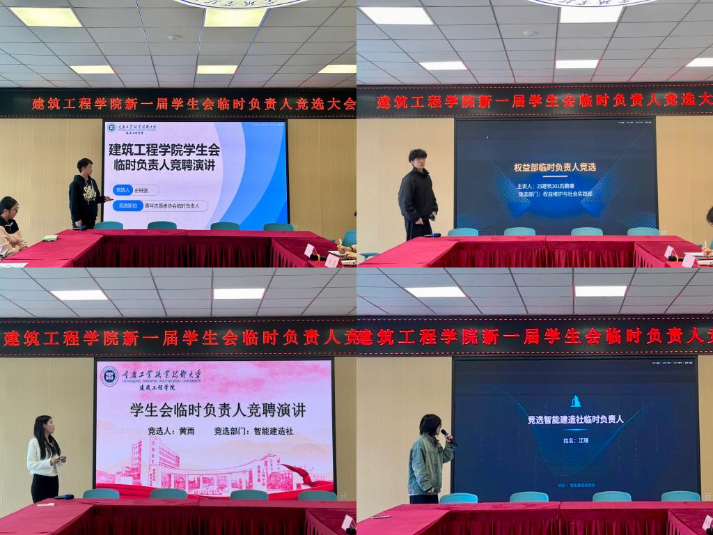 此次学生会临时负责人的竞选大会,不仅为同学们提供了展示自我、锻炼表达能力、提升综合素养的平台,更夯实了学院学生会组织建设基础,明确了后续学生工作的开展方向。后续,学院将综合竞选人的演讲表现、日常工作表现及综合素养,确定最终临时负责人名单。相信新一届的学生骨干定能扛起责任、履职尽责,带领学院学生会各部门高效开展工作,为建筑工程学院学生工作高质量发展贡献青春力量。